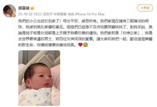 傍晚18点53分,郭富城在微博分享了这一喜讯,他难掩喜悦地写道:“我们家现在拥有三颗璀璨的明珠,我感到无比幸福和富足。姐姐们已经迫不及待地要照顾妹妹了”。