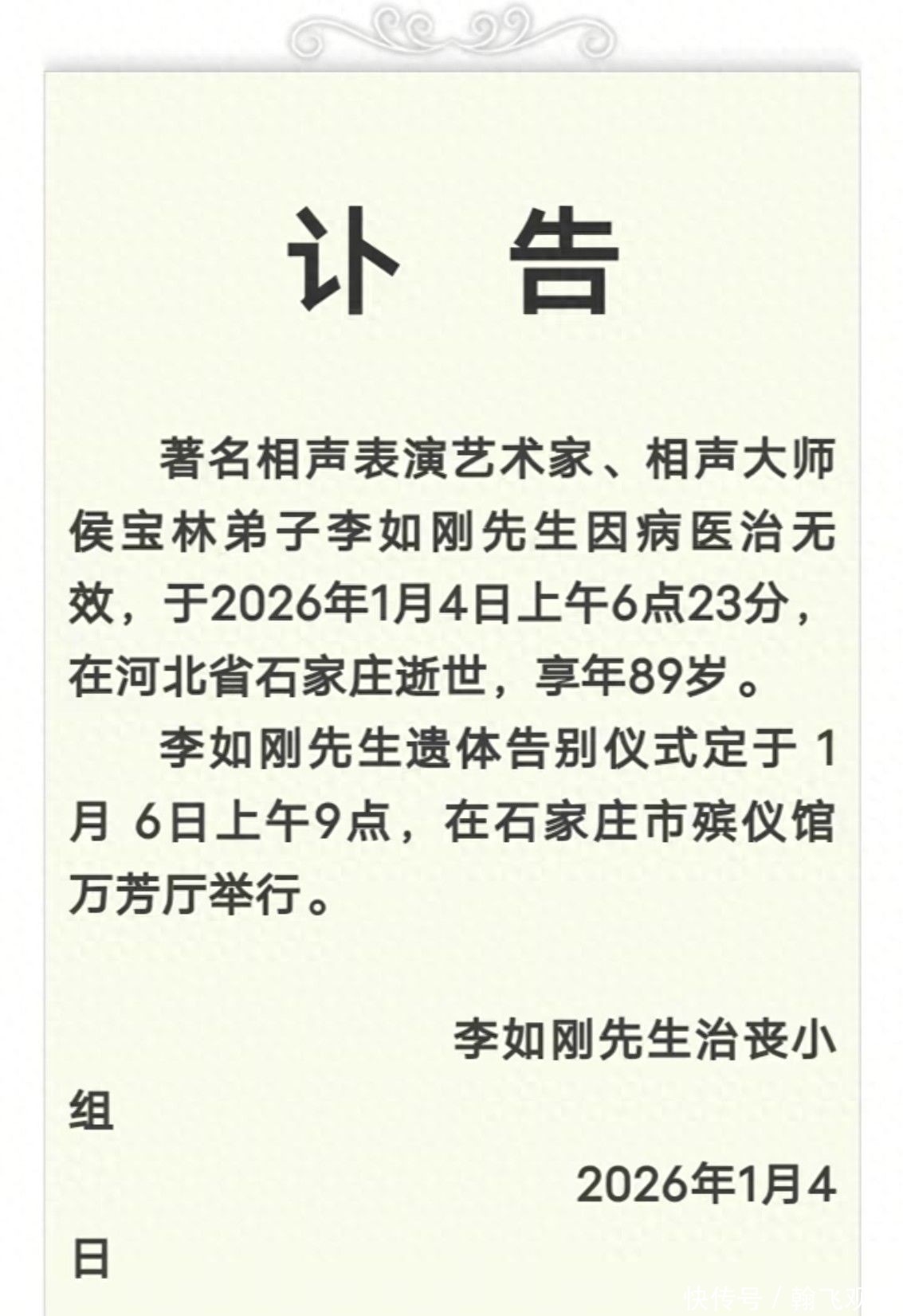 1月4日,著名相声表演艺术家李如刚先生在石家庄因病逝世,享年89岁。这位将毕生心血倾注于传统曲艺的老艺术家,走完了他平静而厚重的一生。