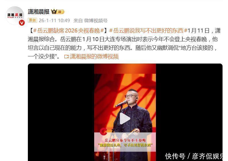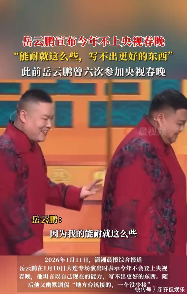 据1月11日报道,岳云鹏在相声专场上的一番坦白,直接把自己送上了热搜。在2026年1月10日的大连专场中,他亲口确认今年将不会登上央视春晚的舞台,理由很直接:“以自己现在的能力,写不出更好的东西。”但紧接着的一句幽默补充——“地方台该接的春晚,一个没少接”——却瞬间让现场画风突变,引发了网友关于“光速打脸”和行业生态的连环热议。