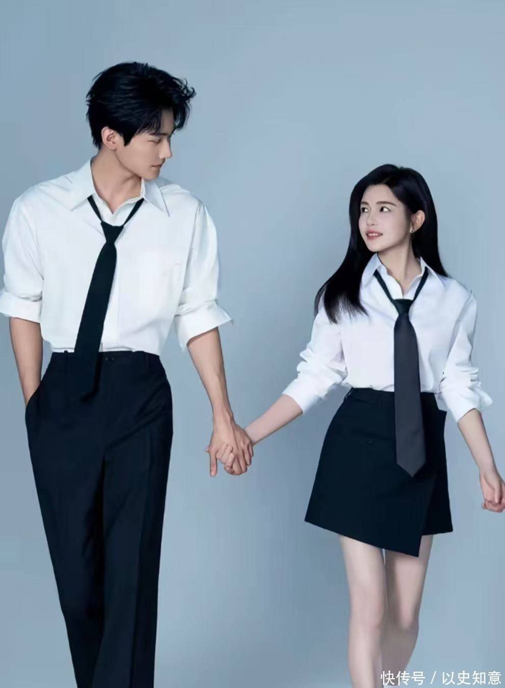 拍照时刻,两人利用显著的身高差制造出截然不同的掌控氛围。